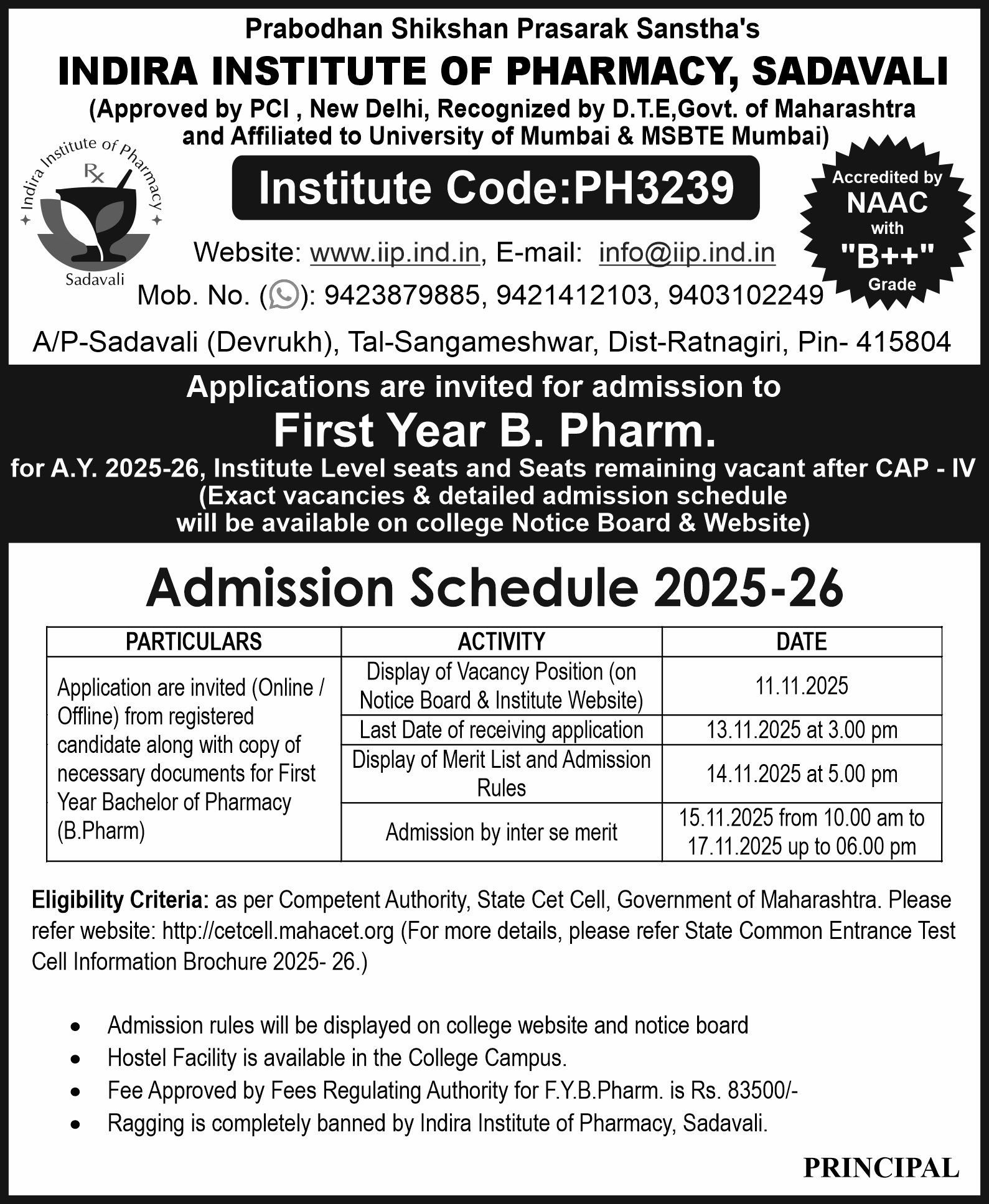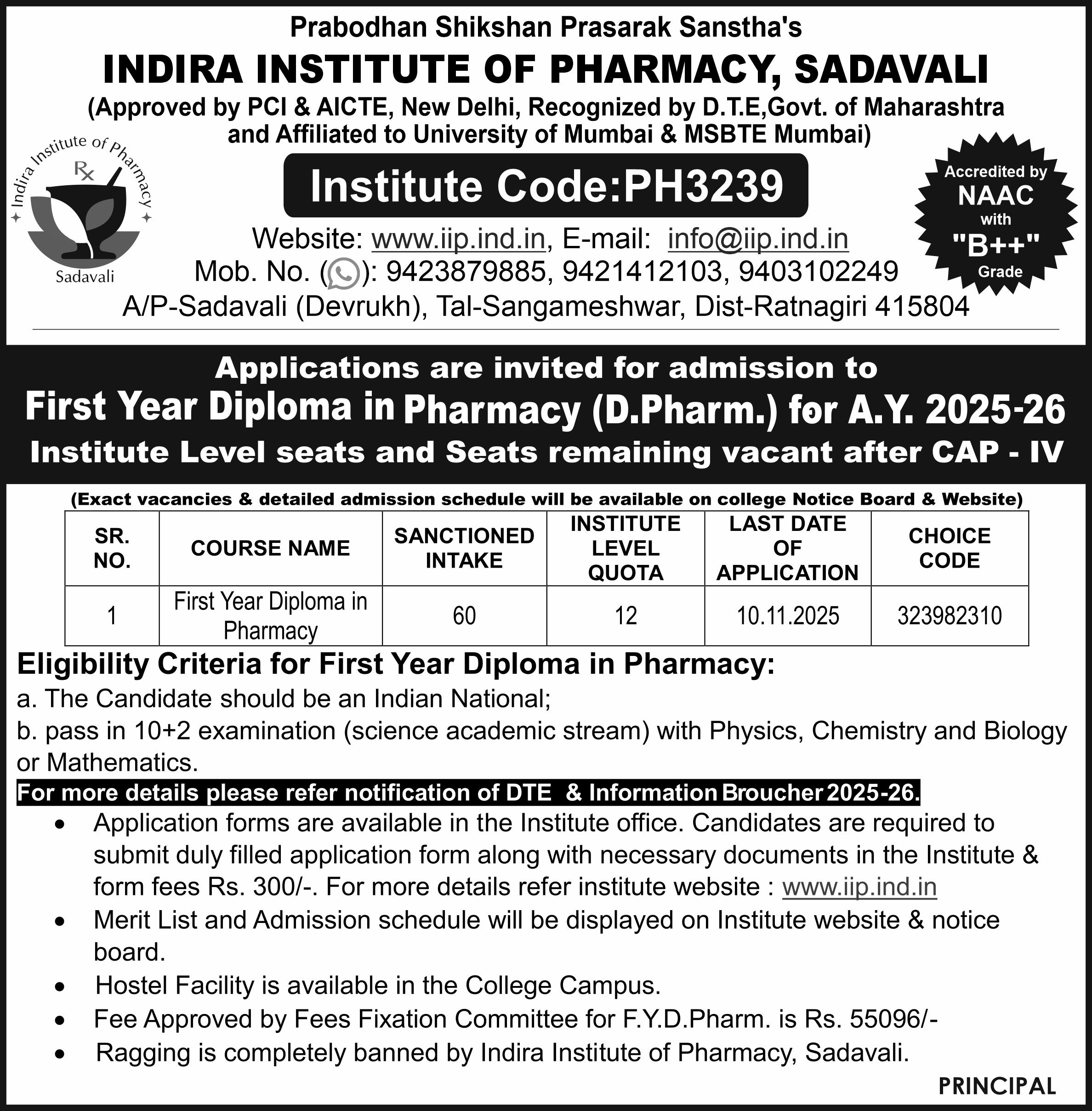Indira Institute of Pharmacy, Sadavali was established in the year 2008 under the flagship of Prabodhan Shikshan Prasarak Santha Ambav, Devrukh.